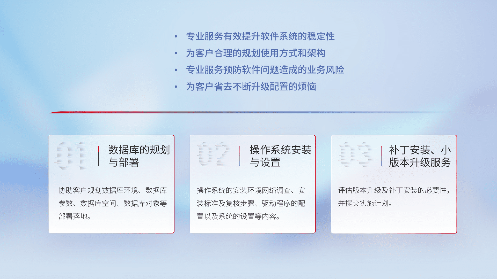 为客户提供软件规模升级、、、快速部署、、按需配置的专业服务,,,,从数据库的规划与部署到操作系统的安装与设置,,,再到补丁安装和小版本升级提供支持。。。